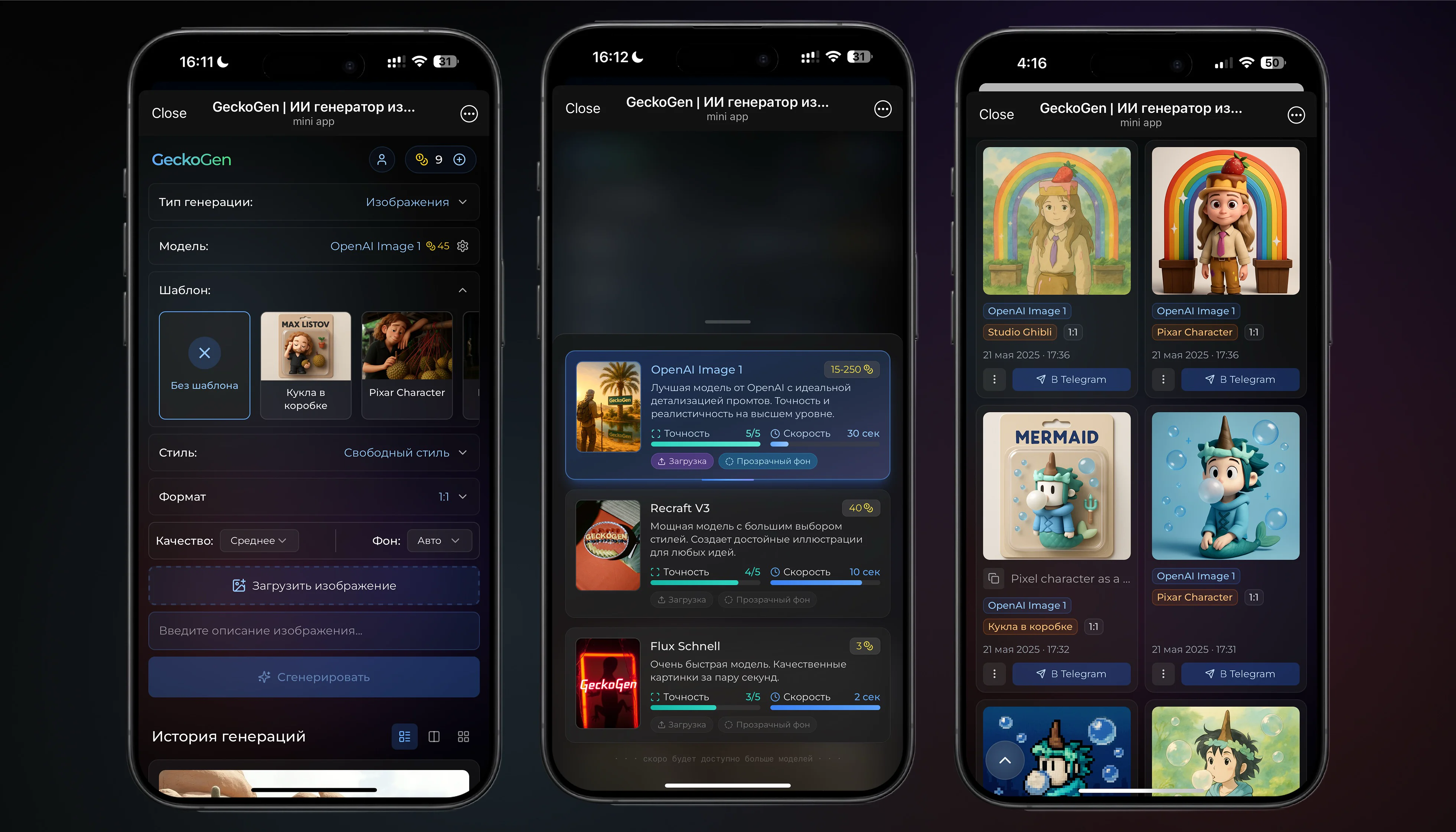 - Три модели для генерации изображений: Recraft V3, Flux Schnell и OpenAI Image 1