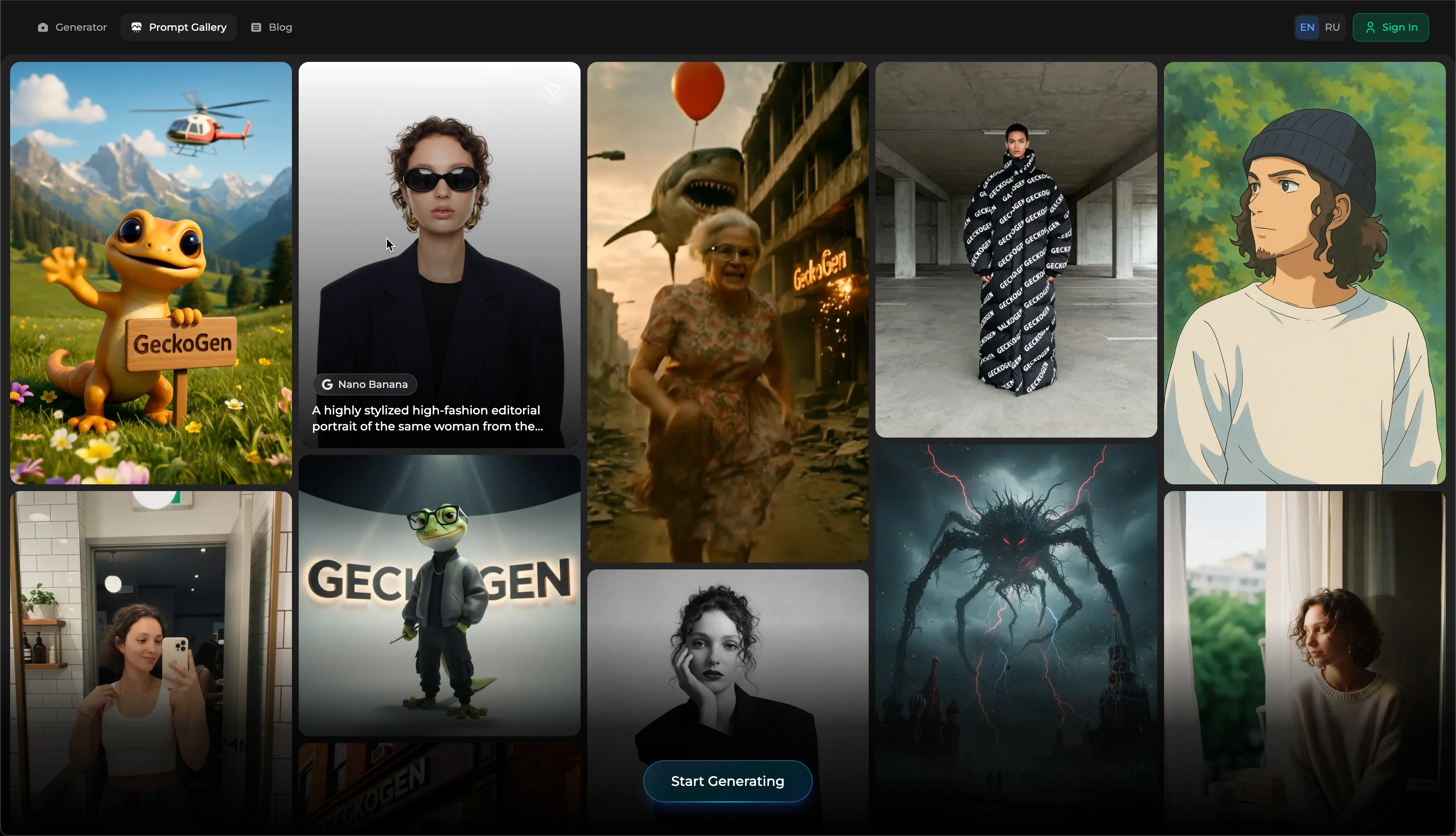 - Галерея промптов — вдохновляйтесь идеями от GeckoGen и его пользователей